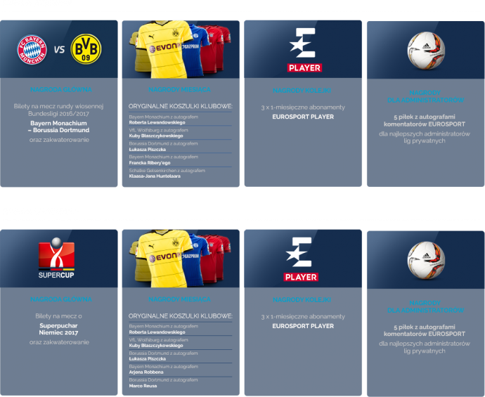 dla pięciu najlepszych administratorów lig prywatnych, tzn. lig, które zdobyły najwięcej punktów w Rankingu Lig Prywatnych oryginalne piłki Bundesligi z autografami komentatorów Eurosport 2.