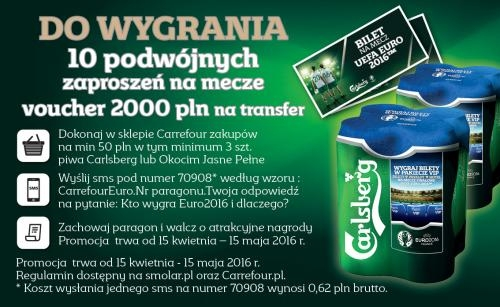 W okresie 15.04-15.05 w wybranych sklepach sieci Carrefour trwa konkurs marki Carlsberg oraz Okocim. Aby wziąć w nim udział należy zrobić dowolne zakupy za minimum 50 zł w tym minimum 3 szt. piwa Carlsberg lub/i Okocim. Następnie wysłać SMS pod numer 70908 według wzoru: CarrefourEuro.Nr paragonu.Odpowiedź na pytanie: Kto wygra Euro i dlaczego ?