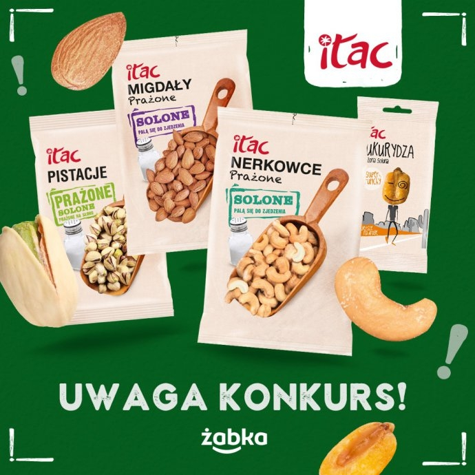 Pod postem konkursowym na Facebooku uzupełnij zdanie: Twoje ulubione orzeszki ITAC + ulubione zajęcie + w Żabce w Twoje miasto! Aby stworzyć zdanie wybierz jeden z pięciu produktów Itac dostępnych w Żabce: Fistaszki, Nerkowce, Migdały, Pistacje, Kukurydza.