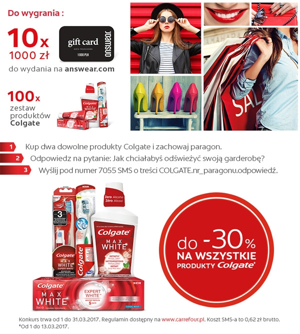 Kup w Carrefour dwa produkty Colgate i odpowiedz na pytanie: "Jak chciałbyś odświeżyć swoją garderobę?". Zgłoszenie wyślij SMSem pod numer 7055 o treści: