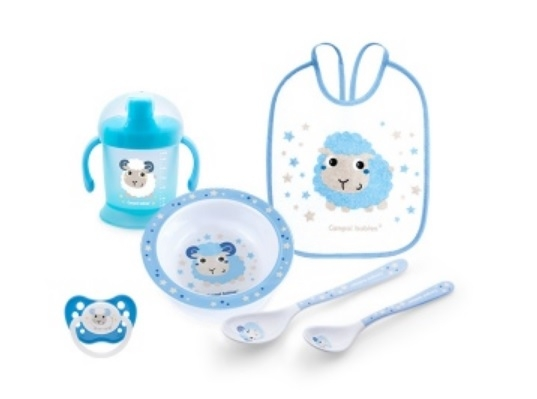 Zestaw od Canpolbabies - kubeczek, miseczka, łyżeczki, smoczek i śliniaczek.