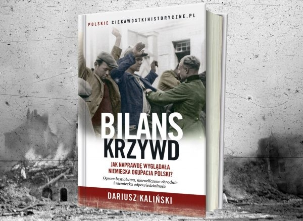 trzy egzemplarze najnowszej książki Dariusza Kalińskiego pod tytułem „Bilans krzywd. Jak naprawdę wyglądała niemiecka okupacja Polski”