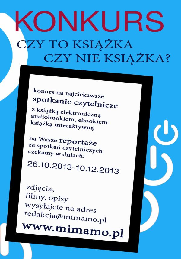 Aby wziąć udział w konkursie należy przesłać do organizatora na adres mailowy redakcja@mimamo.pl relację ze spotkania czytelniczego oraz wypełnić oświadczenie informujące o tym kto, gdzie i z jaką książką się spotkał obcowanie z książką to obcowanie z innym światem, obcowanie z książką elektroniczna to nowa forma konktaktu z tym samym światem nowa forma która pozawala CZYTAĆ ludziom niewidomym, dyslektykom, małym dzieciom i osobom starszym którym klasyczne czytanie sprawia trudność