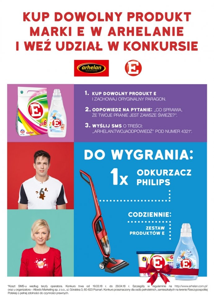 • dokonanie w czasie trwania Konkursu w dowolnym Sklepie Arhelan jednorazowego zakupu proszku, żelu, kapsułek marki ,,E’’ lub płynu do płukania marki ,,E’’