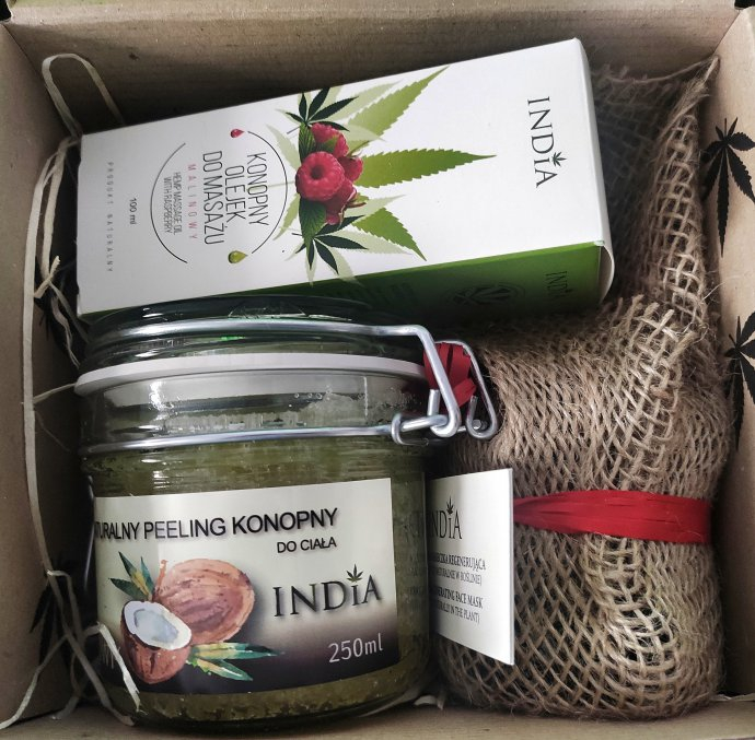 - 1 zestaw Domowe Spa (Naturalny peeling kokosowy, Naturalna maseczka regenerująca (CBD występuje naturalnie w roślinie), Olejek do masażu malinowy) - zestaw pięknie zapakowany w ekologicznym pudełeczku