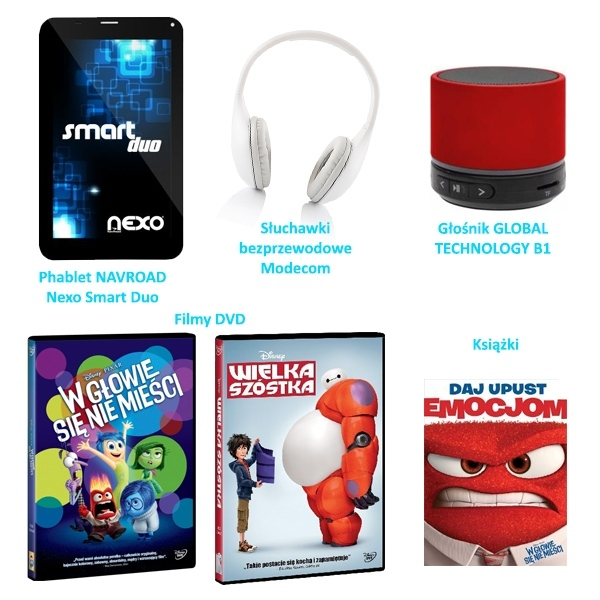 I miejsce: Tablet NAVROAD Nexo Smart Duo, film DVD "W głowie się nie mieści", film DVD "Wielka szóstka", książka "Daj upust emocjom"