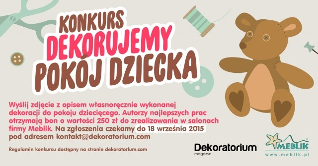 Do 18 września wszyscy miłośnicy majsterkowania lub robótek ręcznych mogą nadsyłać na adres mailowy: kontakt@dekoratorium.com zdjęcia samodzielnie wykonanej dekoracji do pokoju dziecięcego. Czekamy zarówno na pojedyncze zdjęcia ukończonej dekoracji, jak też serię zdjęć obrazujących wykonanie przedmiotu „krok po kroku”. Do pracy prosimy dołączyć krótki opis na temat wykorzystanych materiałów, zastosowanej techniki i samego pomysłu na dekorację.