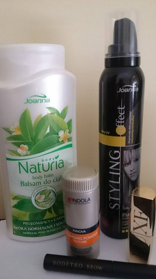 zestaw: Luxe, Szminka do ust, Joanna, Balsam do ciała, Bodetko Brow henna do brwi, Indola Texture, puder na objętość włosów, Joanna, Styling Effect, pianka do włosów