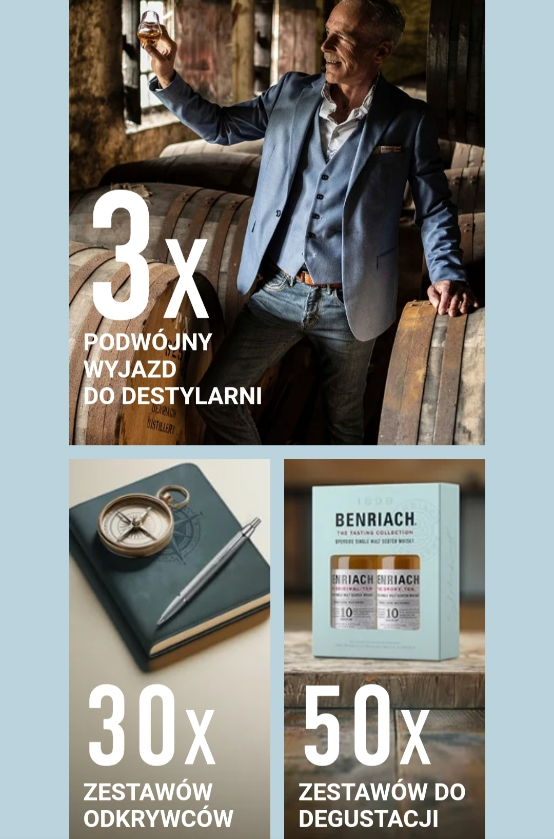 3 Nagrody Główne: wycieczka dla dwóch osób do Szkocji w dniach 28-30.11.2024 wraz ze zwiedzaniem destylarni Benriach - o szacunkowej wartości 8000 zł/osoba.