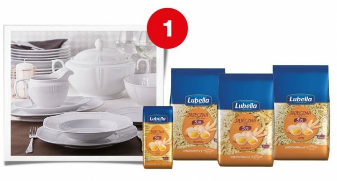 - 1x elegancki, porcelanowy serwis obiadowy dla 6 osób oraz zestaw makaronów Lubella Jajeczna 5 jaj.