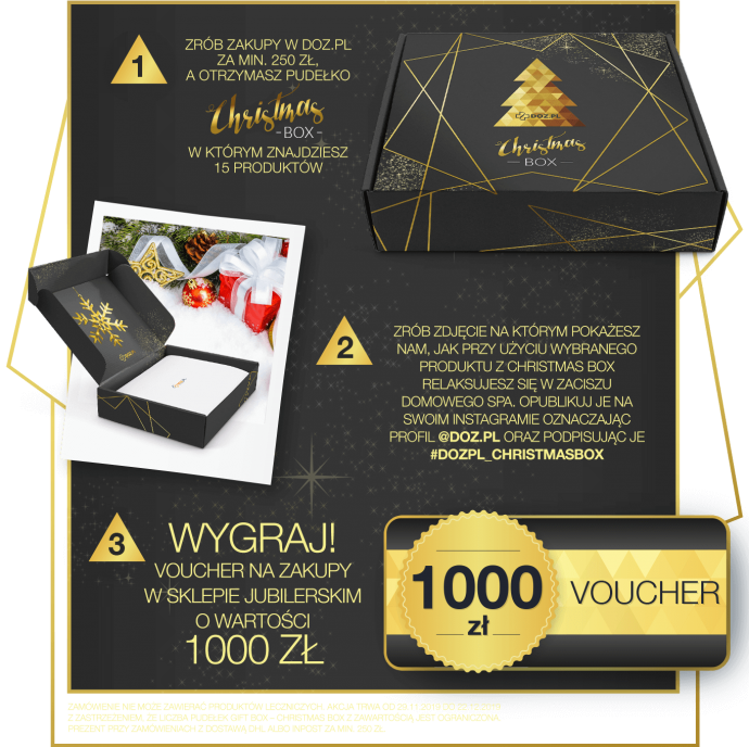 Następnie wykonaj zdjęcie ukazujące jak relaksujesz się w zaciszu domowego SPA z wykorzystaniem jednego z produktów znajdujących się w Christmas boxie, opublikuj je na swoim instagramie oznaczając @DOZ.PL oraz podpisując je #DOZPL_CHRISTMASBOX.