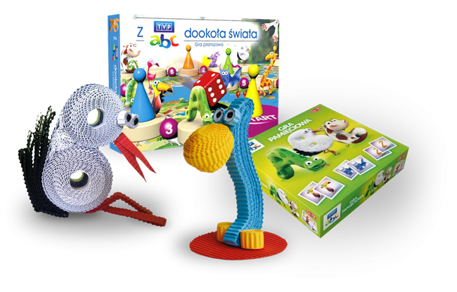 zestaw gier edukacyjnych, każdy składający się z: papierowej literki do własnoręcznego składania, gry planszowej „Z TVP ABC dookoła świata” oraz gry pamięciowej TVP ABC