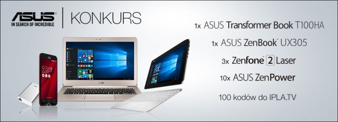 do wygrania: 1 x ASUS ZenBook UX305FA; 1 x ASUS T100HA; 3 x ASUS ZenFone 2 Laser; 10 x ASUS ZenPower; 100 kodów Ipla.tv.