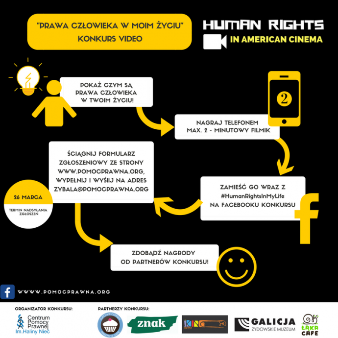Centrum Pomocy Prawnej im. Haliny Nieć wraz z Konsulatem Generalnym USA w Krakowie zapraszają wszystkich zainteresowanych, w szczególności uczniów szkół ponadgimnazjalnych oraz studentów, do udziału w konkursie filmowym pt. „Prawa człowieka w moim życiu”.