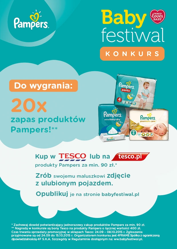 Należy dokonać w jednym ze sklepów Tesco lub w sklepie internetowym Tesco jednorazowego zakupu produktów Pampers na kwotę min. 90 zł, a następnie przesłać zdjęcie dziecka będącego w podróży lub bawiącego się ulubionym pojazdem poprzez stronę babyfestiwal.pl
