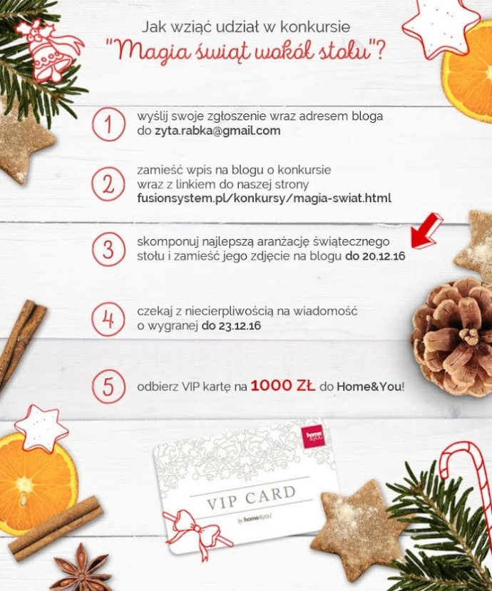 Wystarczy poinformować organizatora na adres zyta.rabka@gmail.com o chęci udziału w konkursie i zamieścić na blogu zdjęcie pięknie przybranego stołu wraz z linkiem do strony konkursowej do dnia 20.12.2016