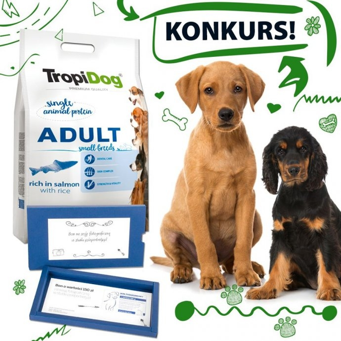 - Nagroda za drugie miejsce to worek karmy TropiDog Premium 8kg w zależności od wieku, wielkości rasy pieska, który wygra. Zestaw gadżetów marki TropiDog oraz Olej z Łososia TropiDog 250ml.