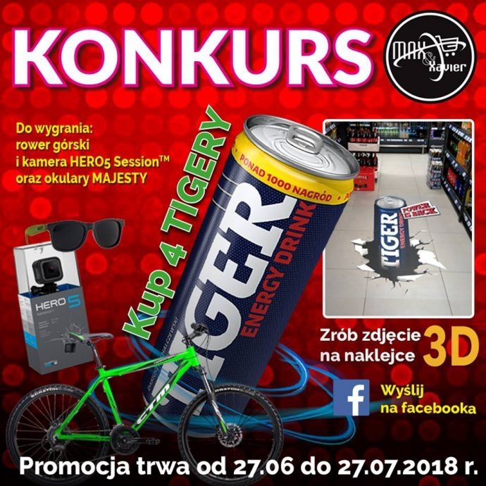 1. W dowolnym sklepie Delikatesy Max Xavier kupicie 4 napoje Tiger Energy Drink i zrobicie sobie zdjęcie na naklejce 3D, które niedawno pojawiły się w naszych sklepach.