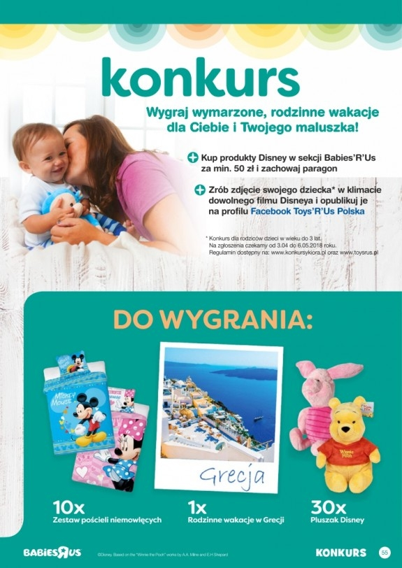 Kup w sieci sklepów Toys "R" Us w sekcji Babies "R" Us - dowolne produkty na licencji Disney za łączoną kwotę minimum 50 zł, wykonaj zdjęcie swojego dziecka w klimacie dowolnego filmu Disneya i zamieść na profilu facebook Toys "R" Us Polska.
