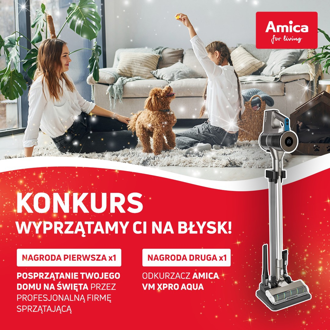 Ekipa pozamiatane.pl wysprząta u Ciebie na błysk odkurzaczem Amica. W ramach drugiej nagrody zgarniesz odkurzacz VM XPro Aqua o potrójnej mocy - sprzątania na sucho, ma mokro i docierający do najmniejszych zakamarków pod meblami!
