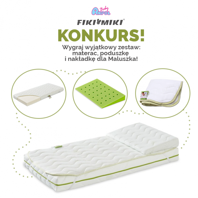 zestaw od marki Fiki Miki– materac lateksowy antyalergic covers, nakładkę higieniczną antyalergic covers oraz poduszkę klin antyalergic covers