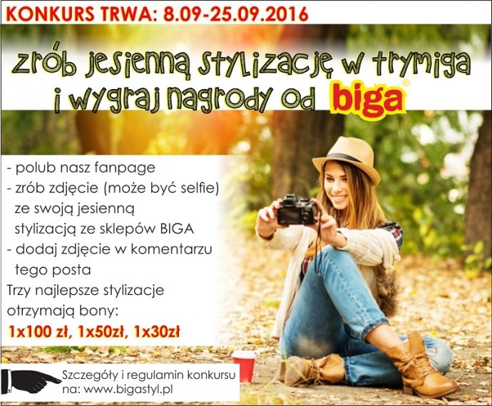 Zrób zdjęcie jesiennej stylizacji stworzonej z ubrań kupionych w sklepie BIGA, dodaj je w komentarzu pod postem konkursowym i wygraj bony na zakupy w sieci sklepów BIGA.