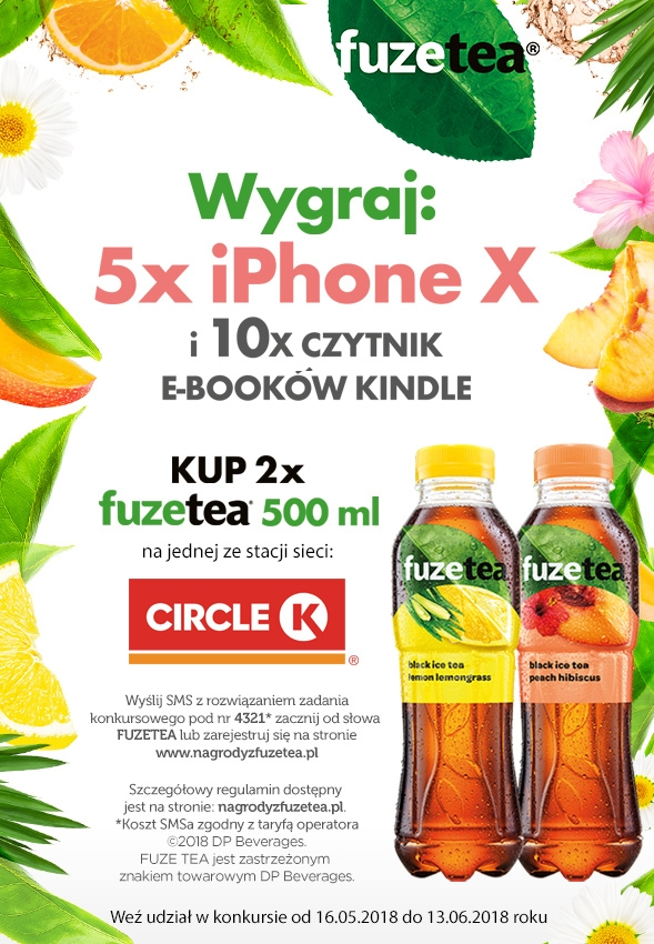 - Dokonać zakupu, na jednej ze stacji Circle K, 2 dowolnych napojów Fuzetea 0,5l (Zestaw Promocyjny).