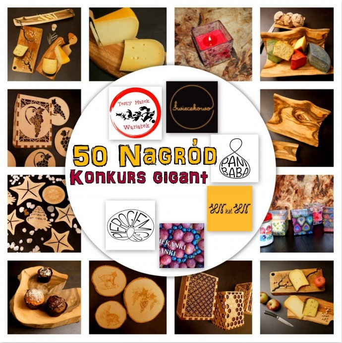 50 Nagród rzeczowych w tym deski, sery, konfitury, podkładki, świeczki.