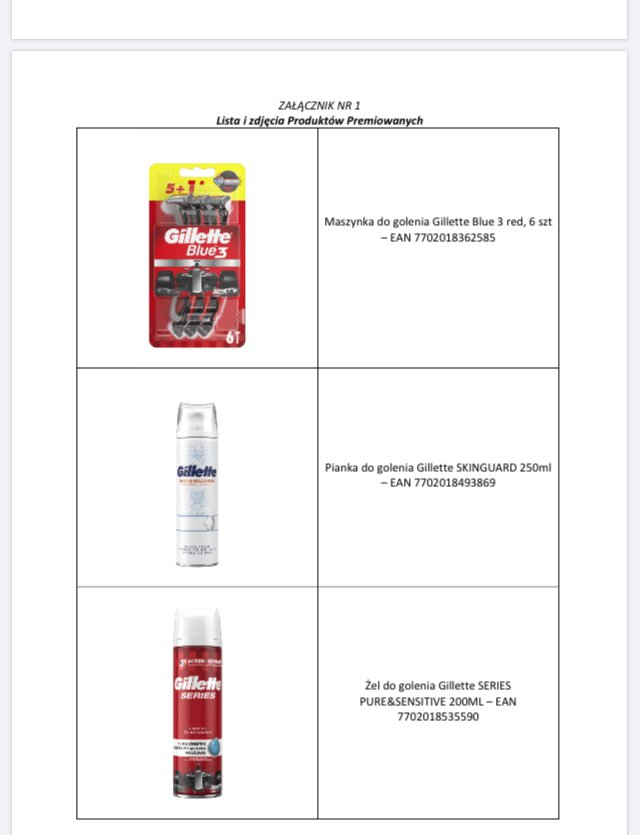 27.05.2020 23:23:50Sprzedażą promocyjną objęte są wyłącznie poniższe produkty marki Gillette dostępne w Sklepach ("Produkt Promocyjny”, „Produkty Promocyjne) tj: . maszynka do golenia Gillette Blue 3 red, 6 szt (kod EAN 7702018362585), pianka do golenia Gillette SKINGUARD 250ml (kod EAN 7702018493869), żel do golenia Gillette SERIES PURE&SENSITIVE 200ML (kod EAN 7702018535590). Zdjęcia Produktów Promocyjnych przedstawione są w załączniku nr 1 do Regulaminu.