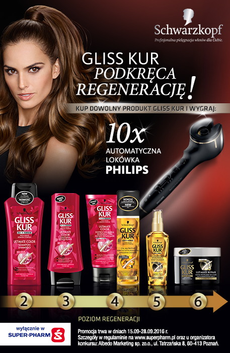 W dn. 15.09-28.09.2016r. kup w drogerii Super-Pharm dowolny produkt Gliss Kur. Pamiętaj by zachować paragon.