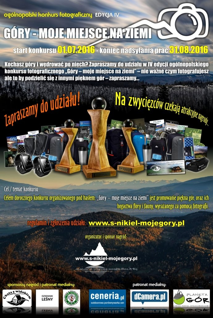 Serdecznie zapaszmy do udziału w kolejnej, już IV edycji ogólnopolskiego konkursu fotograficznego „Góry – moje miejsce na ziemi”, którego jak zawsze, celem jest ukazanie piękna gór, o każdej z pór roku, bogactwa ich flory i fauny, a wszystko to przez pryzmat naszego doświadczenia i emocji jakie wywołują one w nas samych.