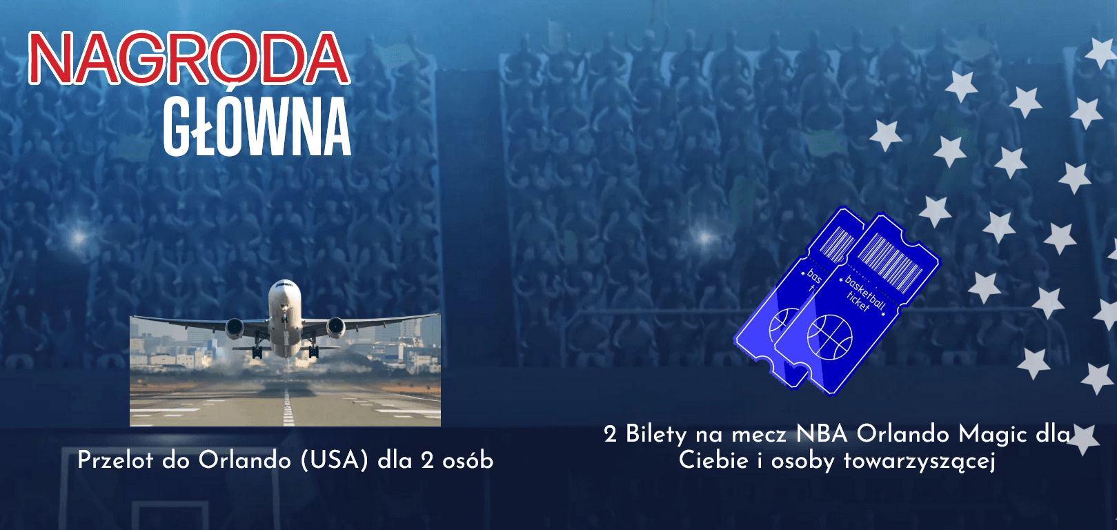 1 wyjazd dla 1 Uczestnika oraz 1 osoby towarzyszącej (ujętej na fotografii będącej przedmiotem Zgłoszenia) na mecz NBA do Orlando (USA) o łącznej wartości około 20 000 zł. Dla uniknięcia wątpliwości Nagrodę Główną może otrzymać wyłącznie Uczestnik oraz osoba ujęta w fotografii załączonej do Zgłoszenia. Nagroda obejmuje: