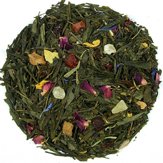 10 herbat liściastych z dodatkiem owoców (przedstawiono na zdjęciu skład: herbata zielona, ananas, skórka róży, miętą, jabłko, mango, kwiat słonecznika, płatki róży i bławatek).