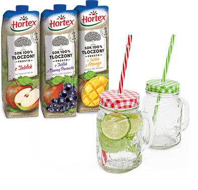 70x Nagroda Gwarantowana: dla osób, które zgłoszą minimum dwa przepisy: jeden z sokiem i jeden z mrożonką wraz z ich zdjęciami - soki tłoczone Hortex i 2 kubki/słoiki