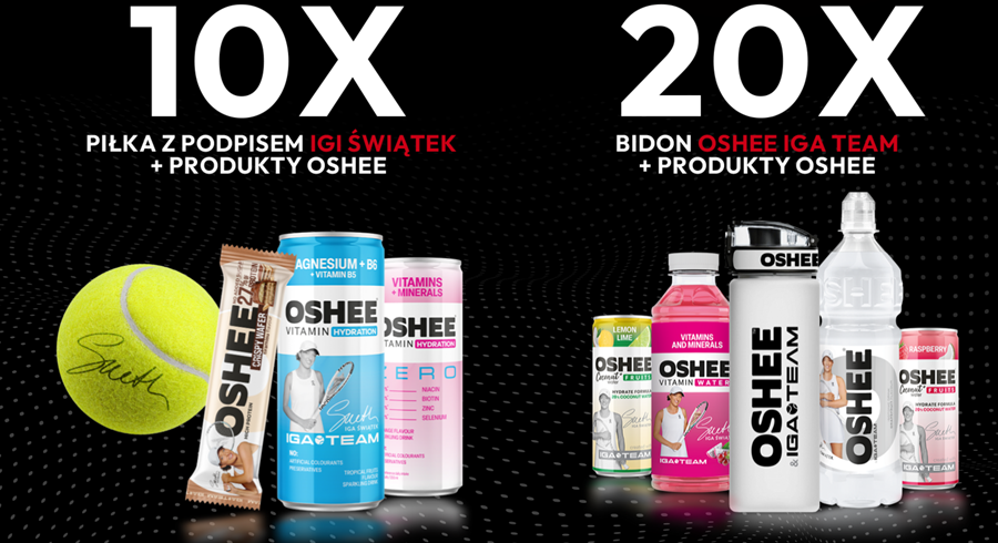 - 10x piłka z podpisem Igi Świątek oraz zestaw produktów OSHEE o łącznej wartości 905,03 zł