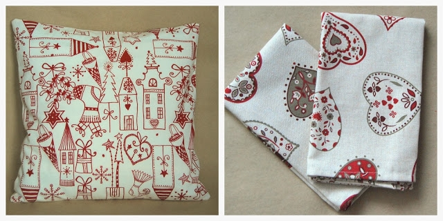 Świąteczna poduszka ze wzorem w stylu skandynawskim oraz komplet kuchennych ręczniczków.