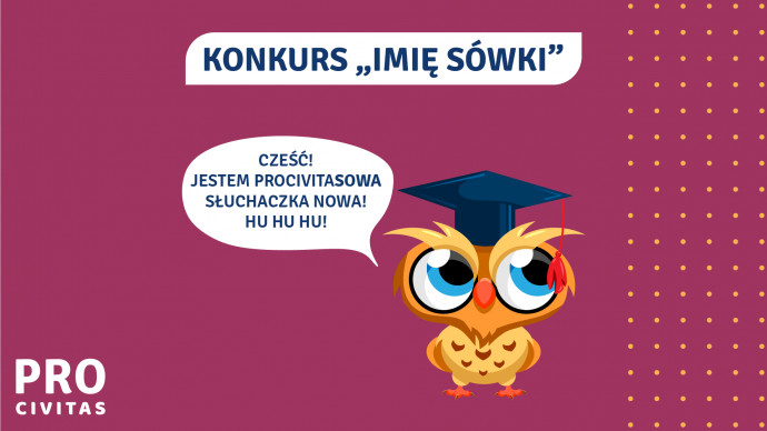 By wziąć udział w konkursie należy wysłać swoje imię i nazwisko, numer telefonu, mail oraz PROpozycję imienia dla sówki na maila tojasowa@procivitas.edu.pl oraz zamieścić pod postem konkursowym na fanpage’u. Tylko kompletne zgłoszenia będą brane pod uwagę w konkursie.