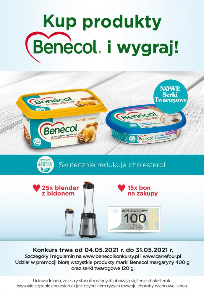 Należy kupić w sklepach Carrefour minimum 1 produkt Benecol margaryna 400 g lub serek twarogowy 120 g, a następnie udzielić odpowiedzi na pytanie.