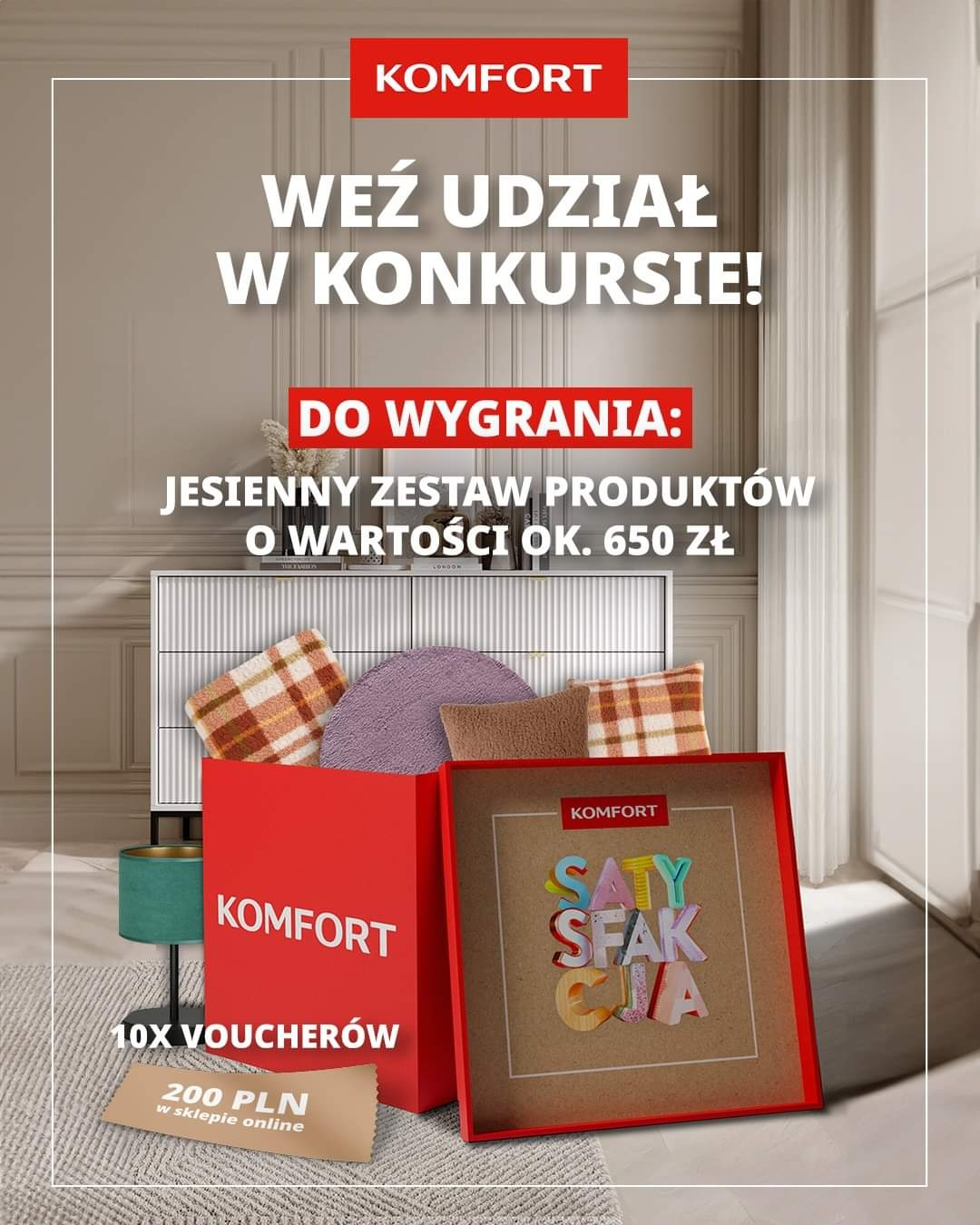 - Nagrody dodatkowe: 10 voucherów o wartości 200 zł do wykorzystania w sklepie online komfort.pl
