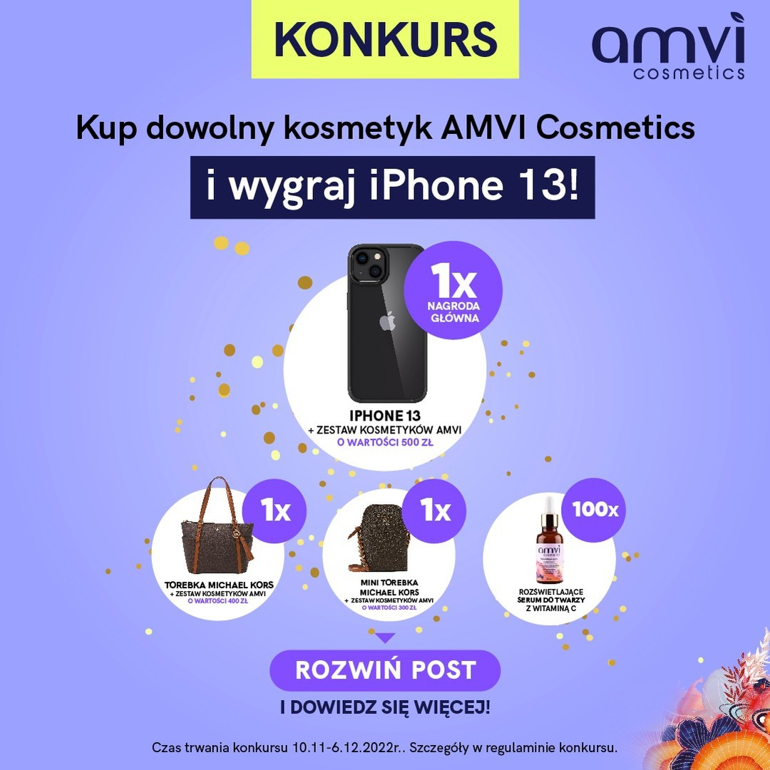 - Jedną Nagrodę Główną: Telefon komórkowy iPhone 13 black 128GB plus zestaw kosmetyków AMVI Cosmetics (o wartości 500 zł), całość o wartości rynkowej około 5 000,00 zł,
