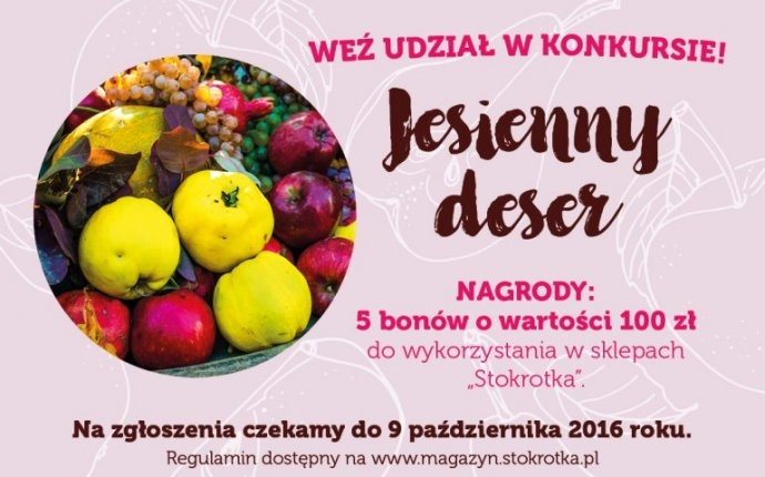 Dobry smak i wyjątkowy gust nie są Ci obce, a do tego możesz pochwalić się talentem fotograficznym? Weź udział w nowym konkursie „Stokrotki”. Prześlij na adresredakcja@stokrotka.pl autorski przepis na deser z jesiennych owoców. Do zgłoszenia dołącz fotografię gotowego deseru lub serię zdjęć dokumentujących jego przygotowanie. Zadbaj o artystyczną, jesienną aranżację.