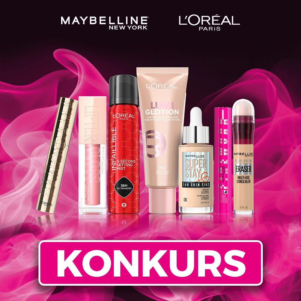 - 100x zestaw produktów L’Oreal Paris i Maybelline (tusz do rzęs L'Oréal Paris Panorama, spray utrwalający L'Oréal Paris Infaillible, podkład rozświetlający Maybelline Super Stay 24H Skin Tint, korektor Maybelline Instant Eraser Concealer, rozświetlacz L'Oréal Paris Glotion oraz błyszczyk Maybelline Lifter Gloss Silk o łącznej wartości 357,94 zł)