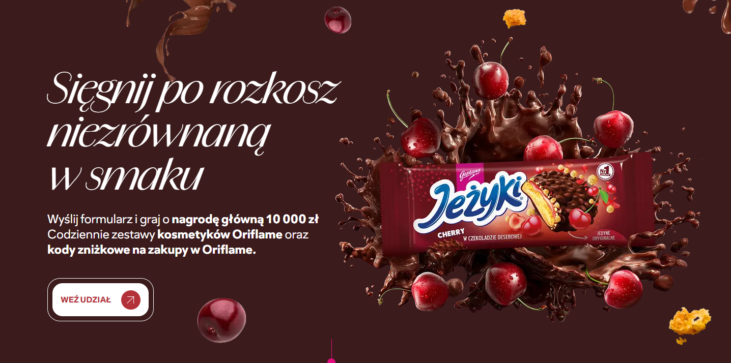 - 140x Nagroda dzienna I stopnia (10 codziennie) – zestaw kosmetyków Oriflame (woda perfumowana 50 ml i krem do rąk Love Potion Cherry On Top) + opakowanie ciastek Jeżyki Cherry 140g o łącznej wartości 164,49 zł