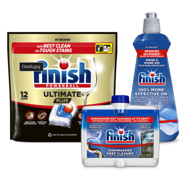 150 produktów: kapsułki Finish Ultimate PLUS, płyn nabłyszczający Finish, płyn do czyszczenia zmywarki Finish