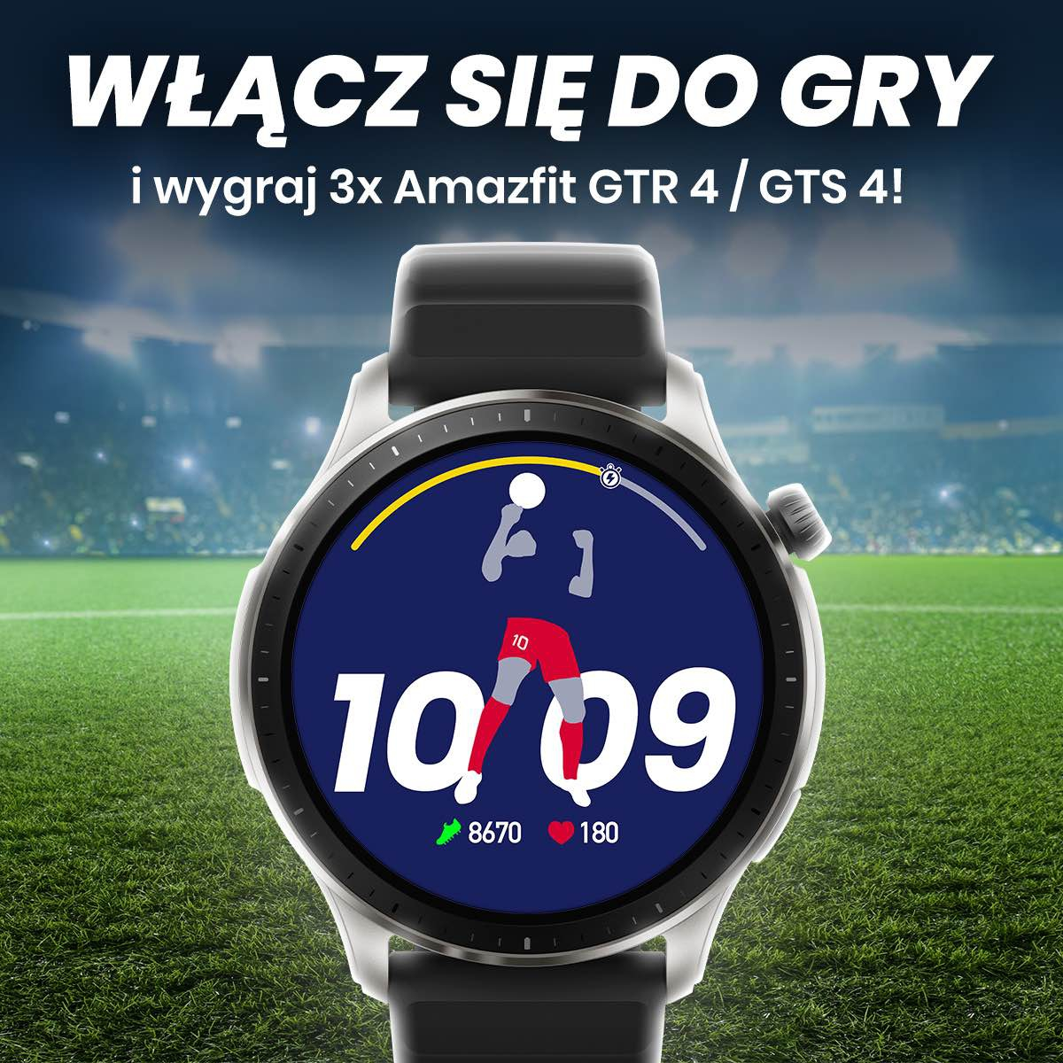 Trenuj jak mistrz i kibicuj biało-czerwonym w osiąganiu celów. Wrzuć na Instagrama lub Facebooka zdjęcie z hashtagiem #KibicujeZAmazfit, na którym pokazujesz jak trzymasz kciuki za polską drużynę. Wygraj jeden z trzech smartwatchy Amazfit GTR 4 / GTS 4 / GTS 4 Mini, z którym możesz monitorować swój trening piłkarski, śledzić parametry organizmu oraz analizować trasę przebiegniętą na płycie boiska.