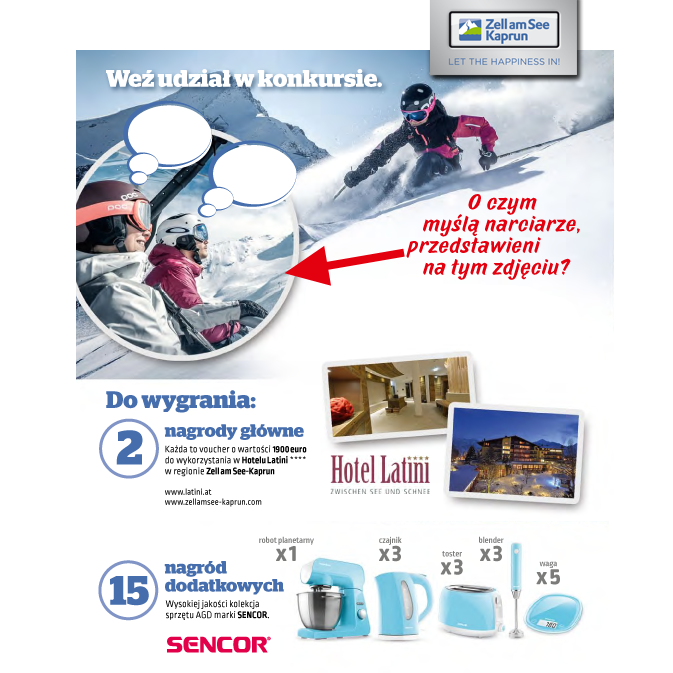 2 Nagrody Główne, z których każda to: jeden dwuosobowy voucher na pobyt (5 nocy) w hotelu 4**** Latini w regionie Zell am See-Kaprun w Austrii. W pakiecie śniadanie i obiadokolacja oraz 4-dniowy skipass. Pobyt na podstawie voucheru można zrealizować przez rok od jego wydania, w terminie uzgodnionym z hotelem, według zasad obowiązujących w hotelu.