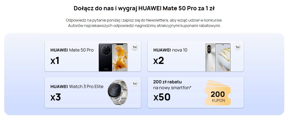 - 50 szt - kupon o wartości 200 zł na zakup smartfonów HUAWEI nova 10 , HUAWEI nova 10 Pro oraz HUAWEI Mate 50 Pro