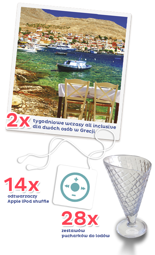 c. dla laureatów trzeciego stopnia: zestaw 2 pucharków na lody z limitowanej serii o wartości 14,00 zł brutto. Elementem dodatkowym nagrody jest nagroda pieniężna w wysokości 1,56 zł, z przeznaczeniem do odprowadzenia do właściwego naczelnika urzędu skarbowego tytułem podatku dochodowego od obu nagród. Każdy z laureatów drugiego stopnia otrzymuje taką samą nagrodę.