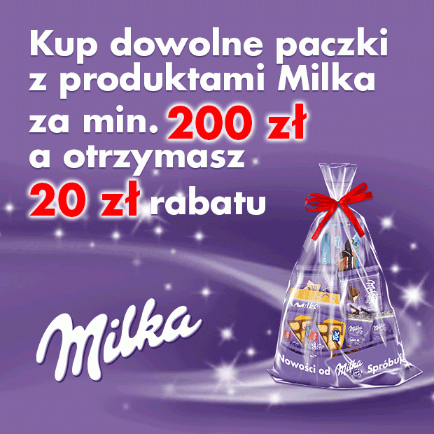 Konkurs "Kup dowolne paczki z produktami Milka za min. 200 zł i otrzymasz 20 zł rabatu"