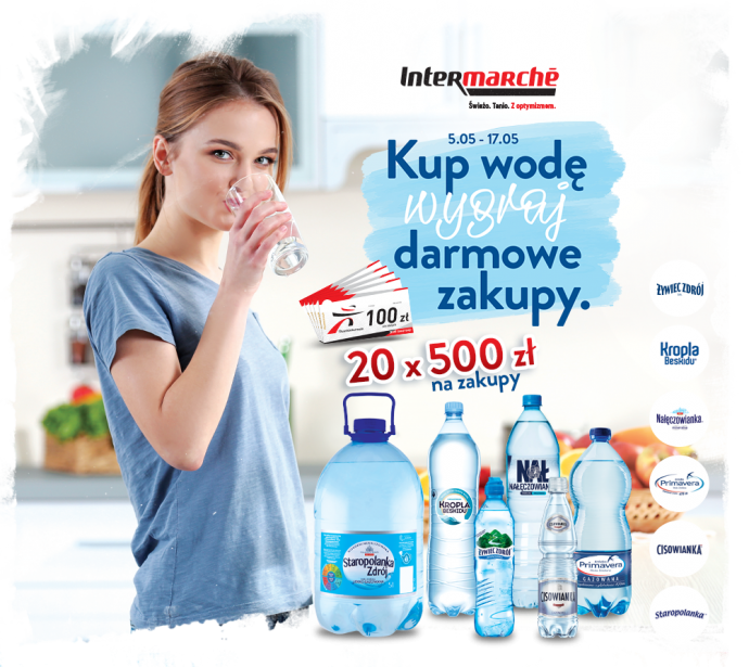 - Kup w Intermarche promocyjne wody wymienione w załączniku do regulaminu za min.10zł, zachowaj paragon.